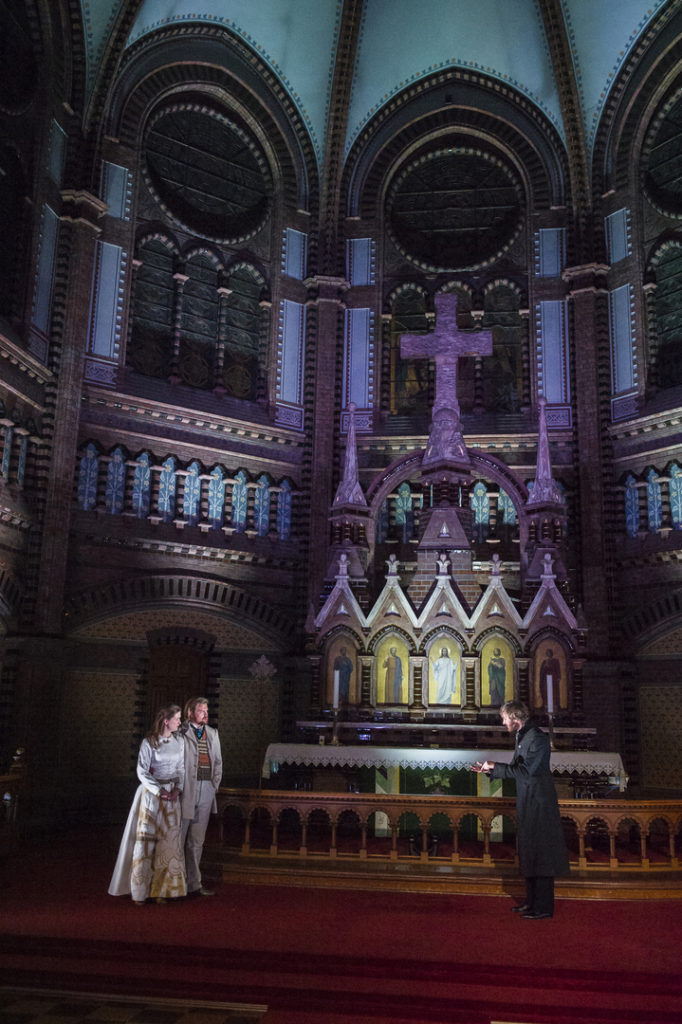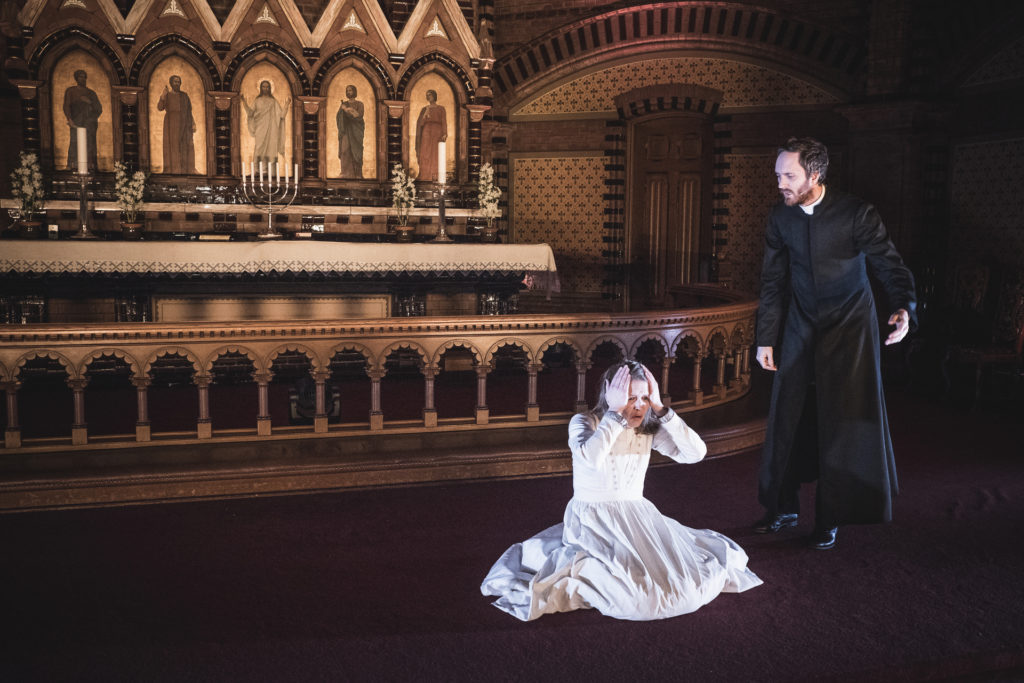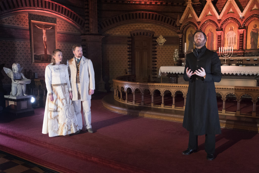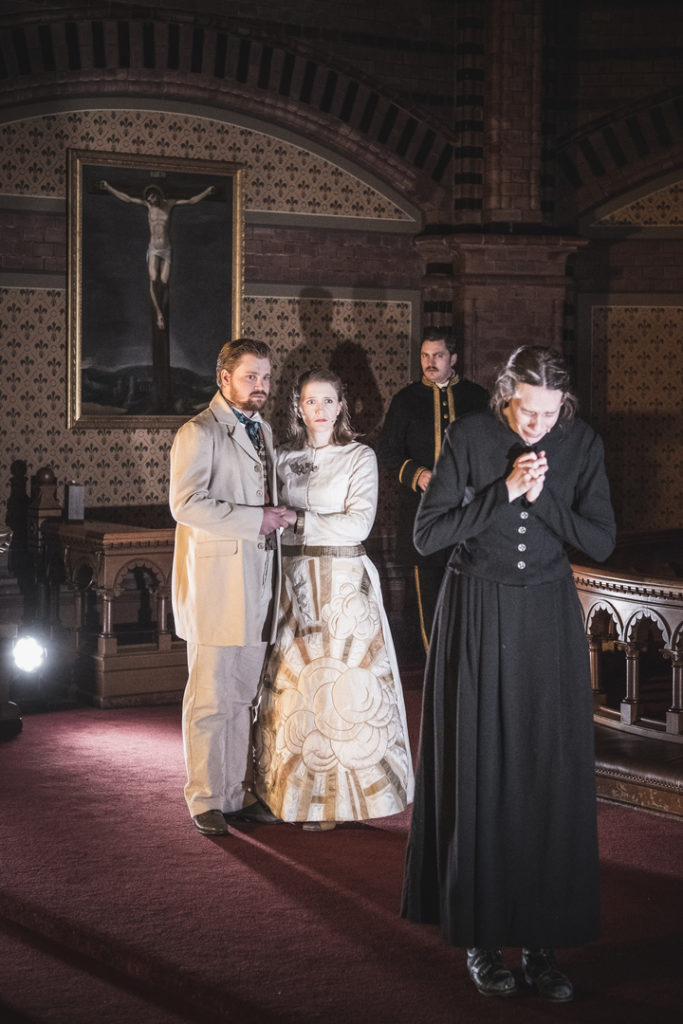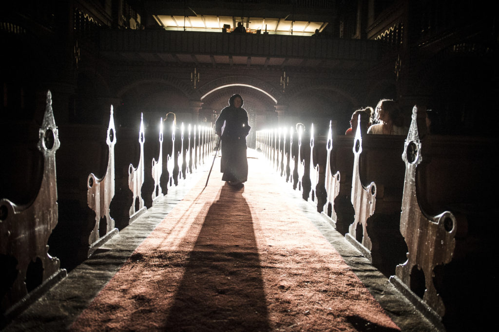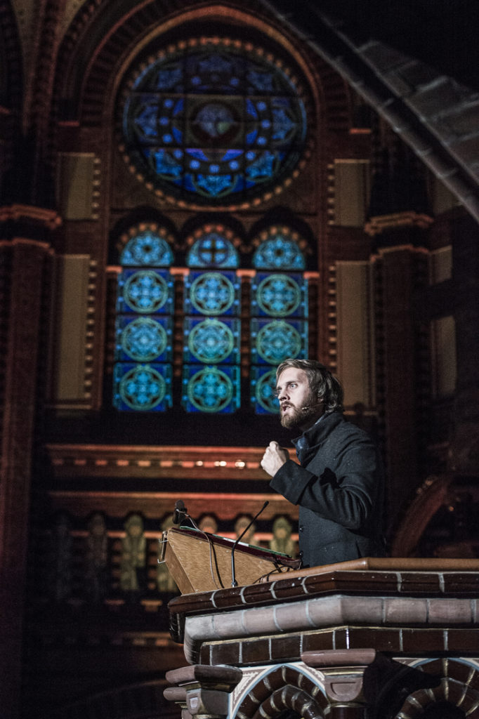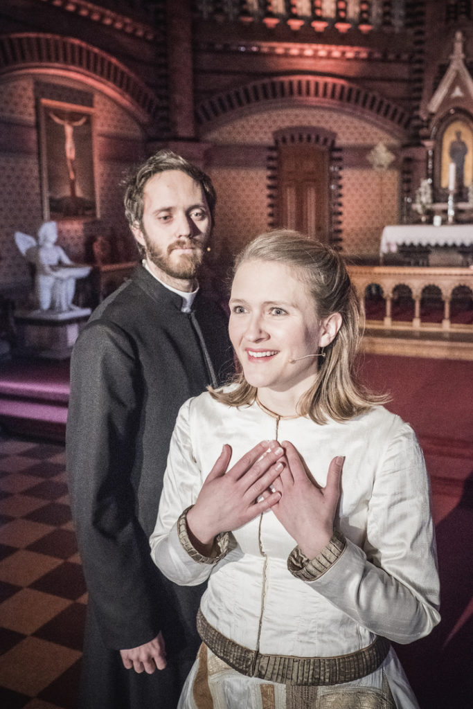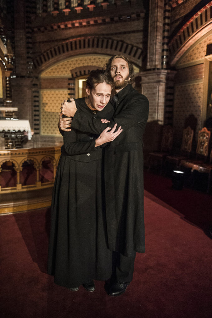 I Teater Ibsens oppsetning flytter vi dramaets tro, tvil og makt inn i kirkerommet. Vi lar presten Brand virke som prest, på ordentlig. Forestillingene blir utelukkende spilt i kirker, og en av Europas aller beste organister, Kåre Nordstoga, tonesetter forestillingen.