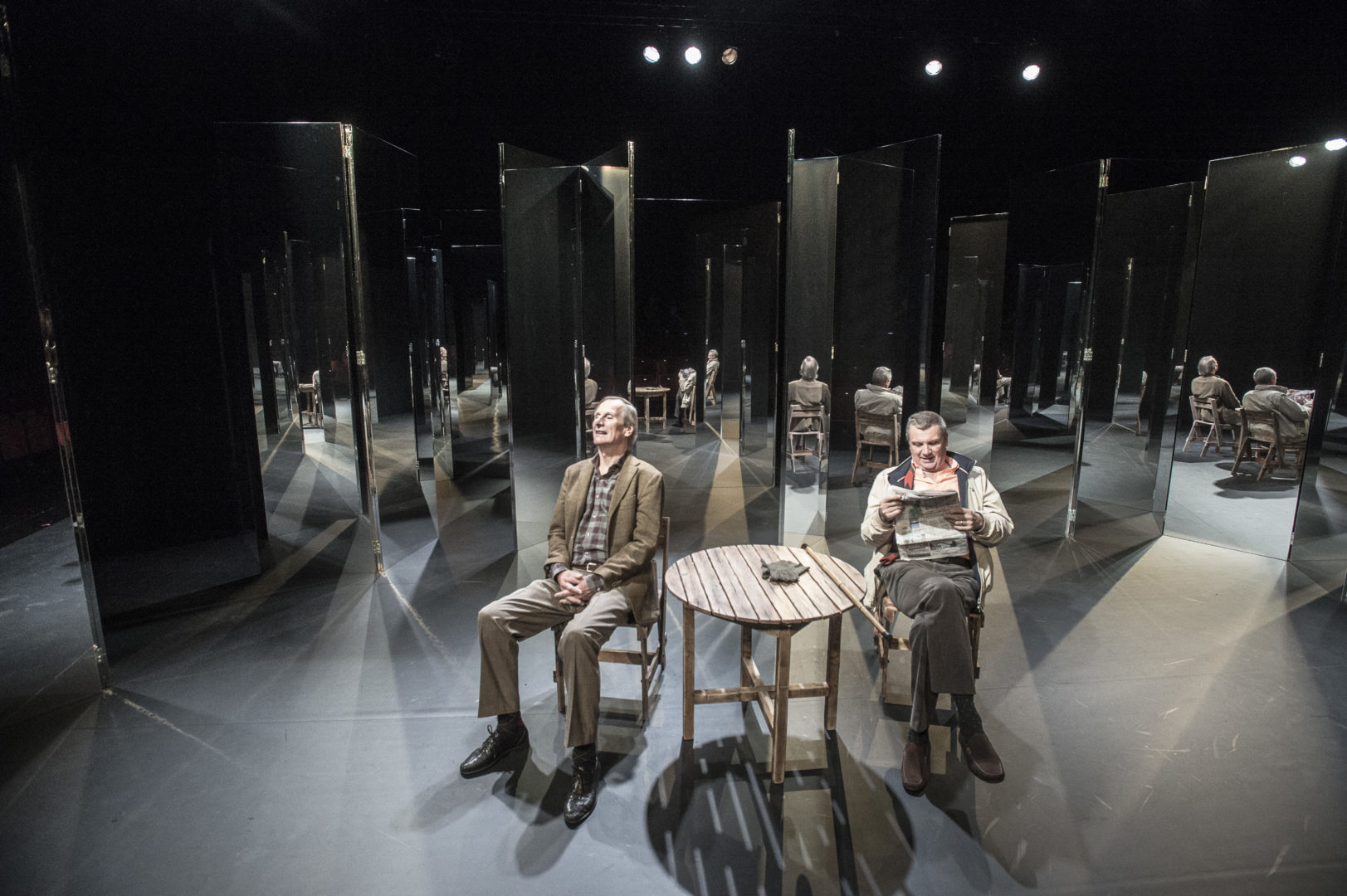 Det er en fascinerende blanding av Sartres «For lukkede dører» hvor hovedtesen er: HELVETE ER DE ANDRE og Beckets » Mens vi venter på Godot».